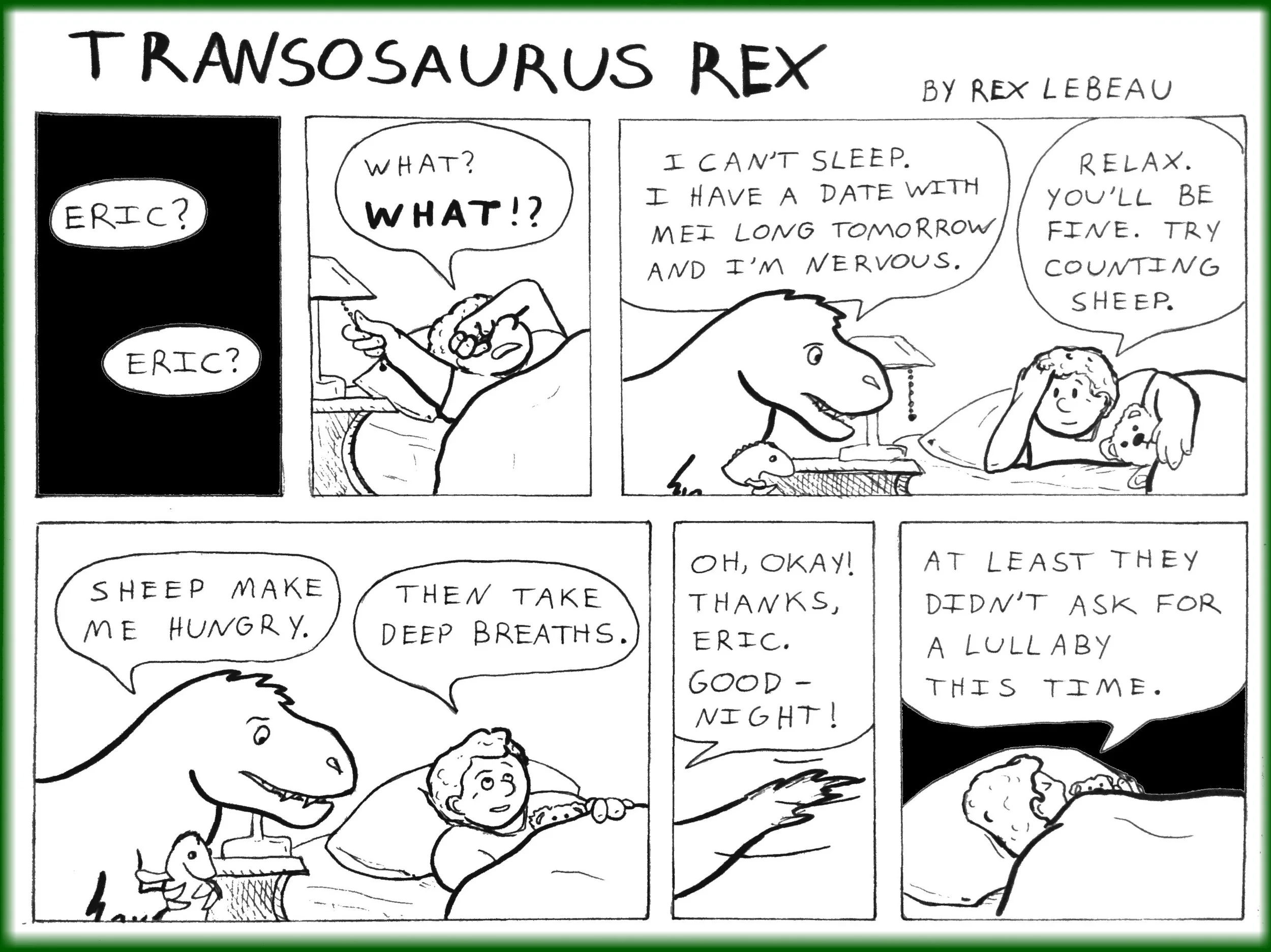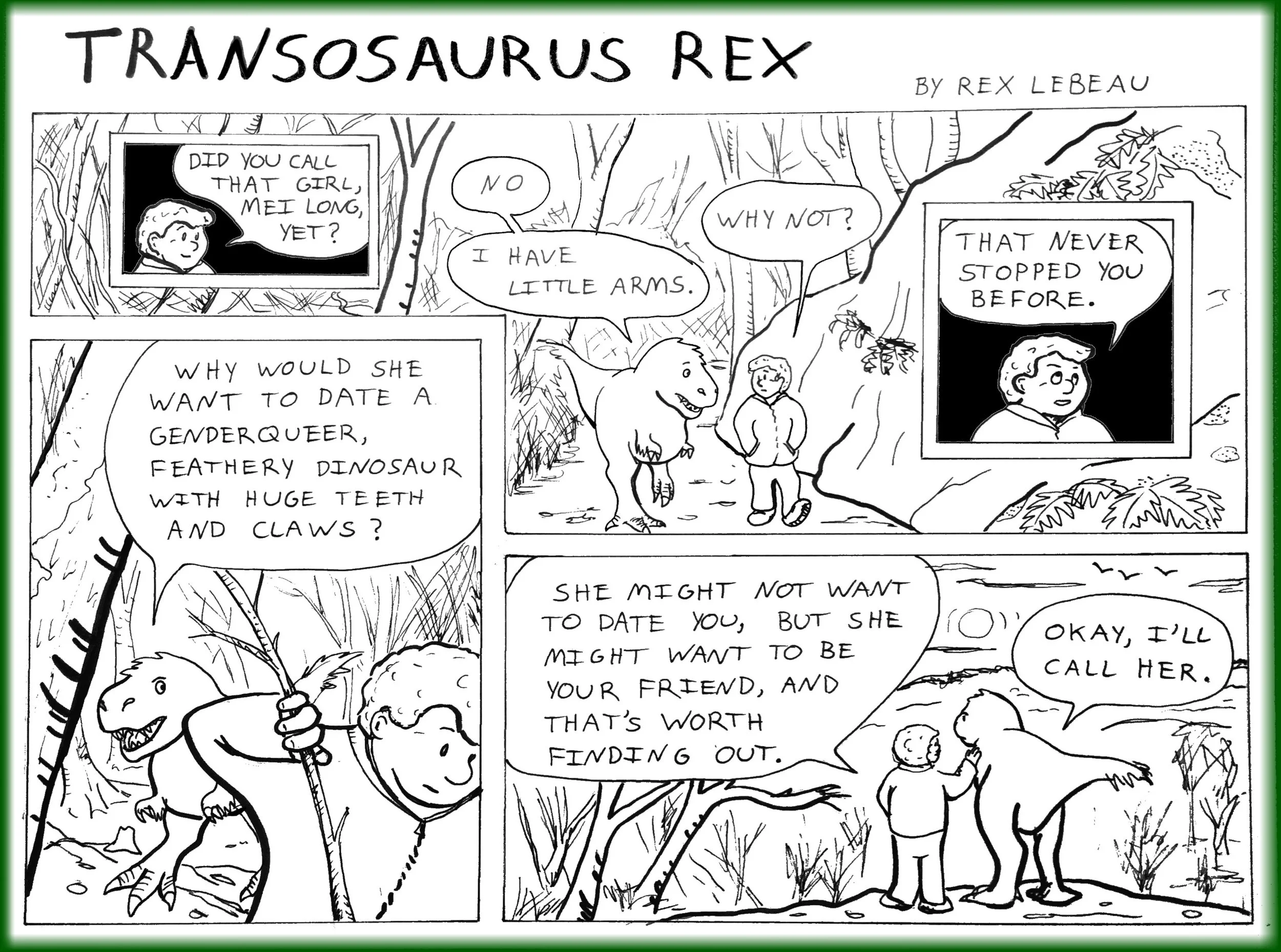 I'm trying to stay away from the overused T. rex tiny arm jokes. Here, T-Rex is trying to use them as an excuse for not doing something they fear. Eric's response is sort of an anti-tiny-arm joke.